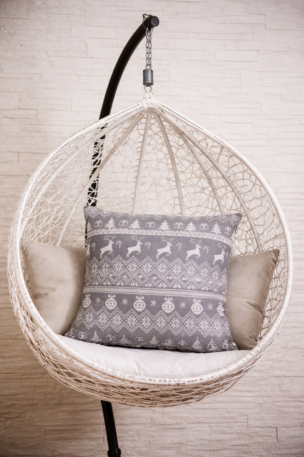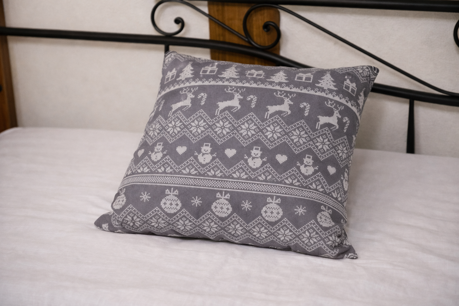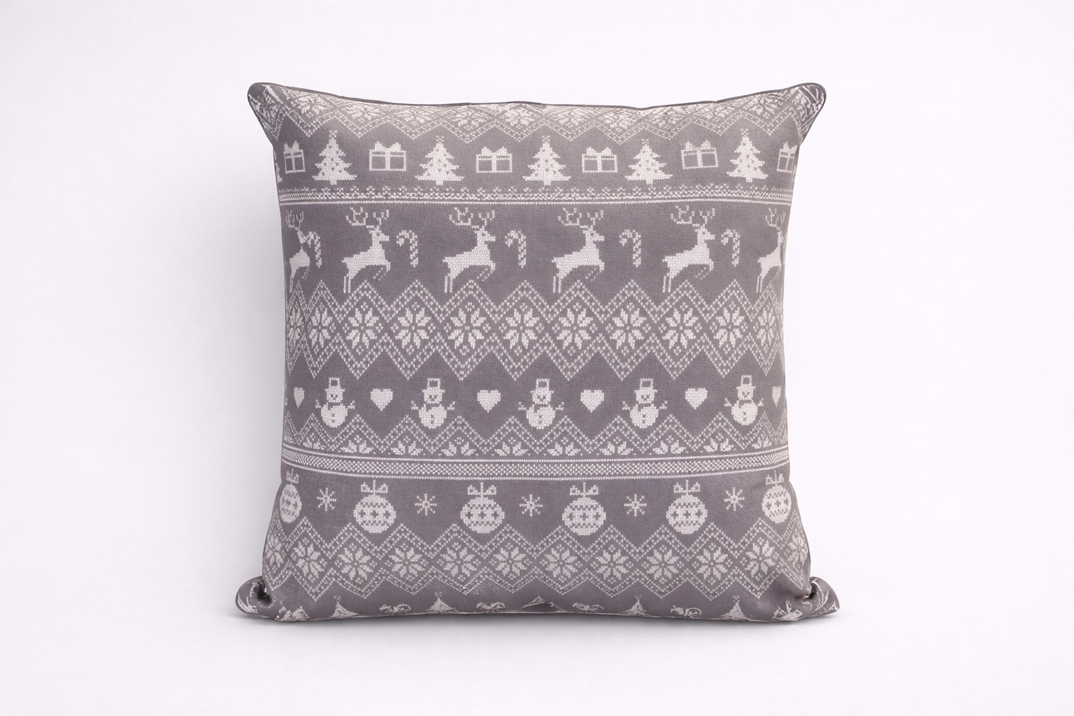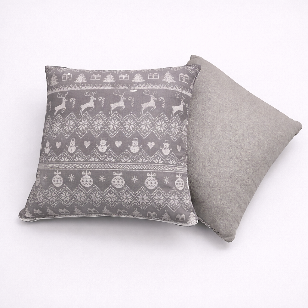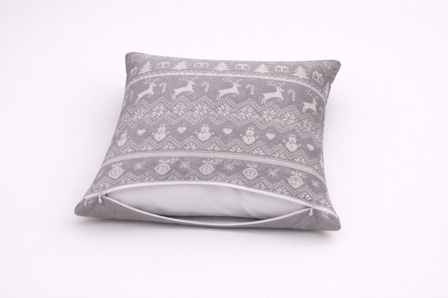 Dizains: 1 gab dekoratīvā spilvendrāna 45 x 45cm ar slēdzēju un pildījums ir 100% poliesters. Spilvendrānai viena puse trikotāža ar dizainu-balti brieži uz pelēkā un otra puse lina auduma krāsa – gaiši pelēka. Slēptais slēdzējs, krāsa – balta.