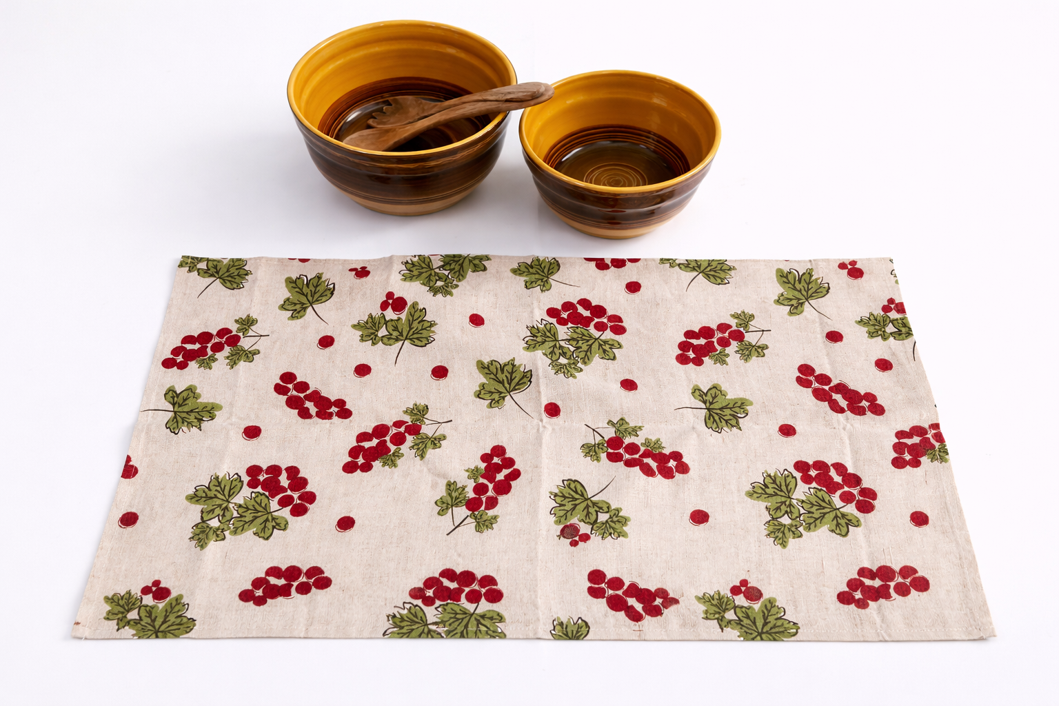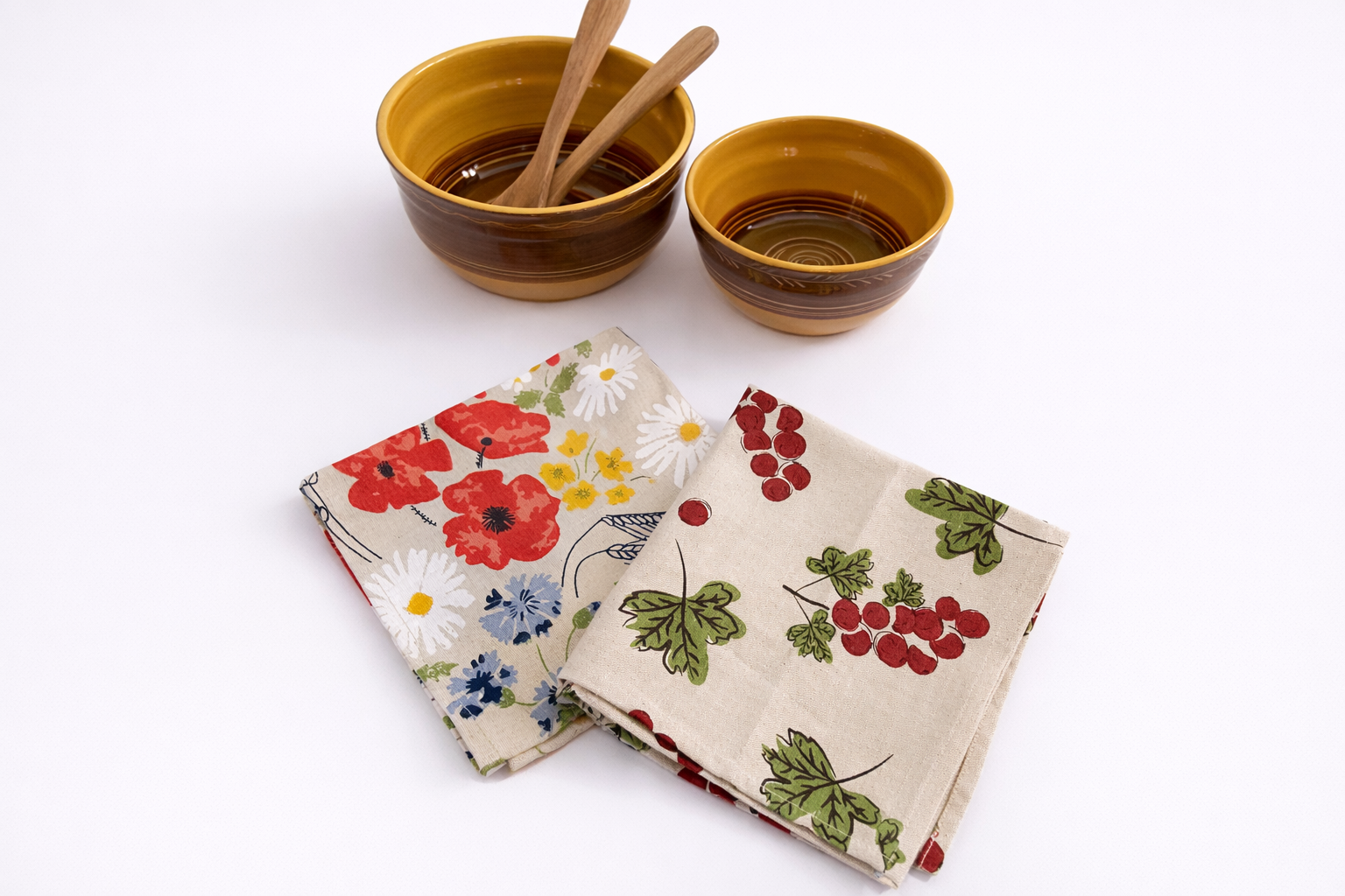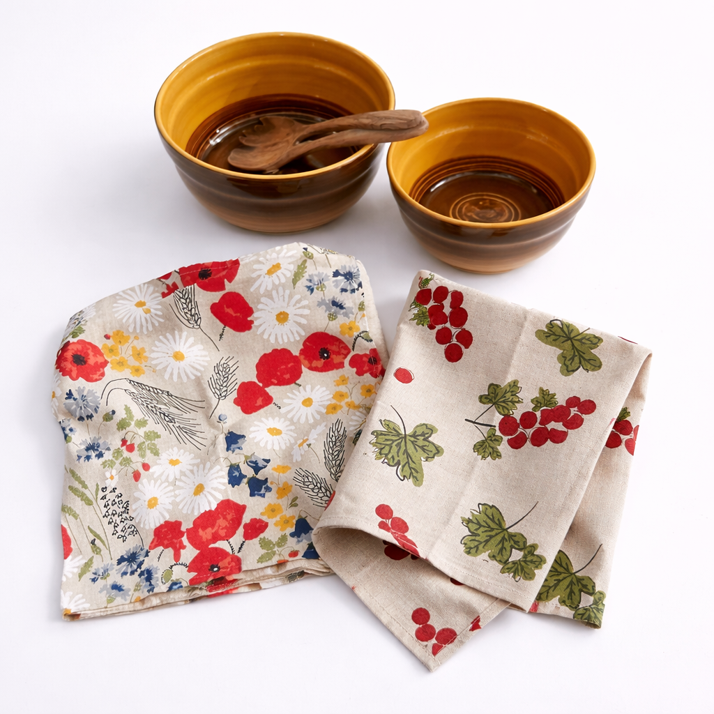 Komplektā ietilpst 2 gab lina dvieļi 45x80cm. Viens dvielis ar zīmējumu – jāņogas un 1 gab dvielis ar zīmējumu – magones. Dvieļi ir tikai paredzēti trauku vai roku slaucīšanai, kā arī var izmantot kā galda sedziņu.