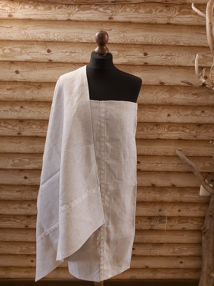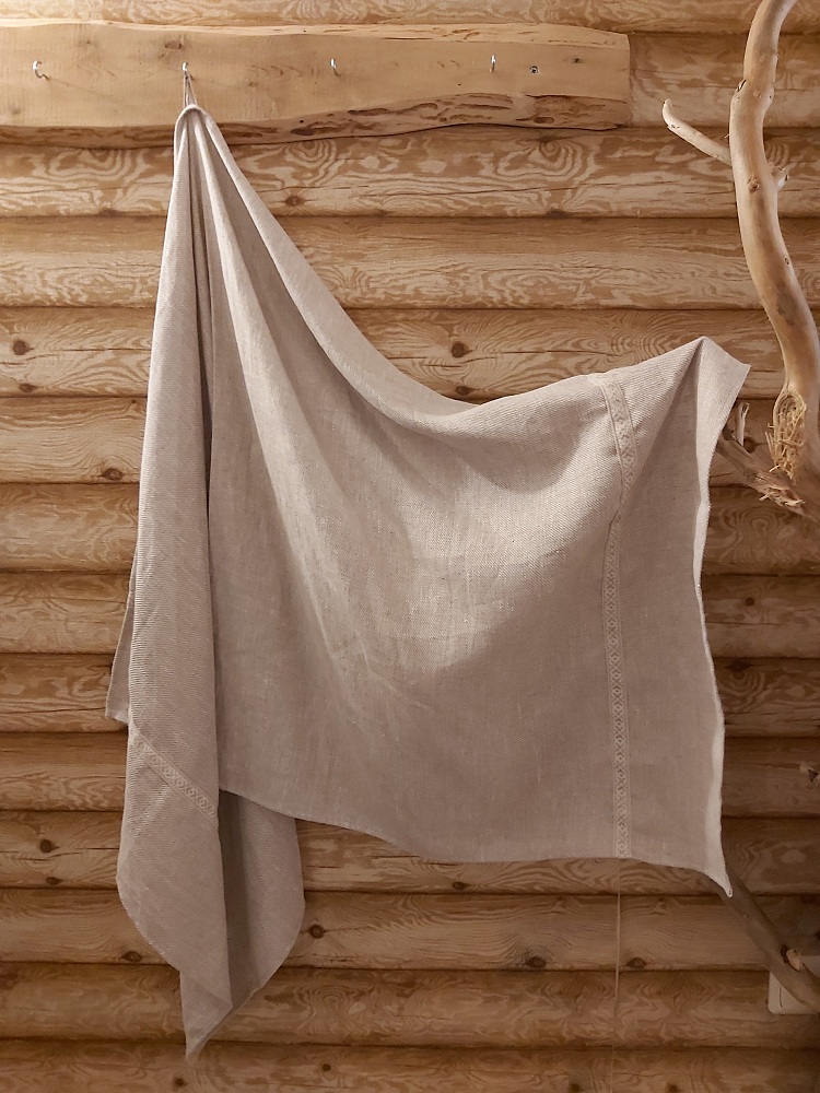 Lina dvielis 80x145cm ar 1.5 cm platu pelēkbaltu tautisku lentu abās dvieļa malās.