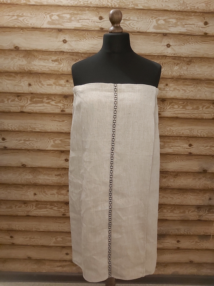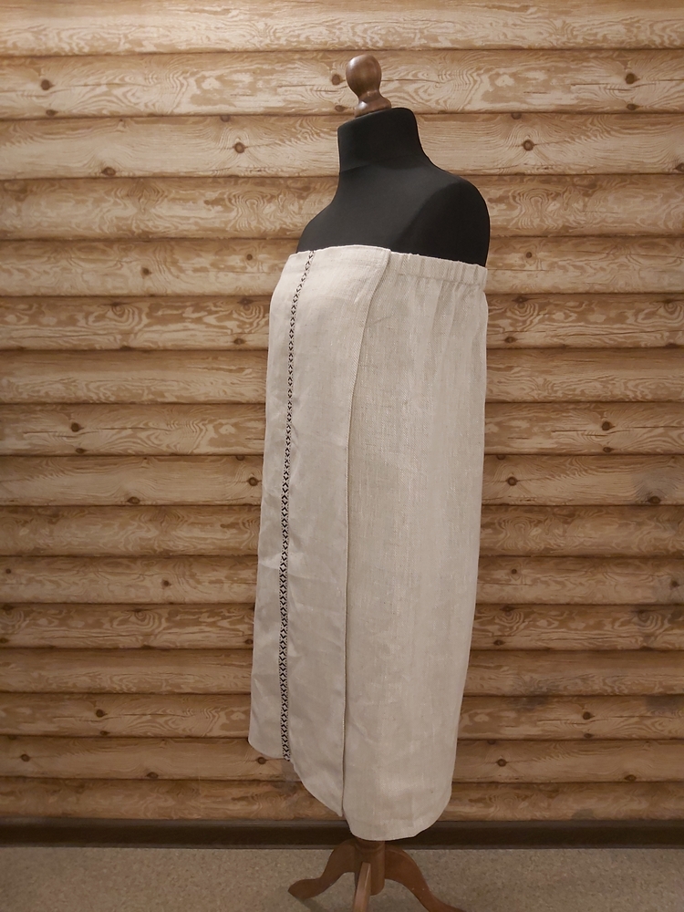 Ērti lina auduma pirts svārki ar 1 cm platu sūnu pelēkzaļu tautisku lentu vertikāli un ar 2 lipekļa aizdarēm augšdaļā. Muguras daļā no viena sāna līdz otram sānam iestrādāta 2cm plata gumija. Apkārtmērs augšdaļā izstiepjot gumiju līdz ~102 cm. Sieviešu pirts svārkiem garums ir 80cm.