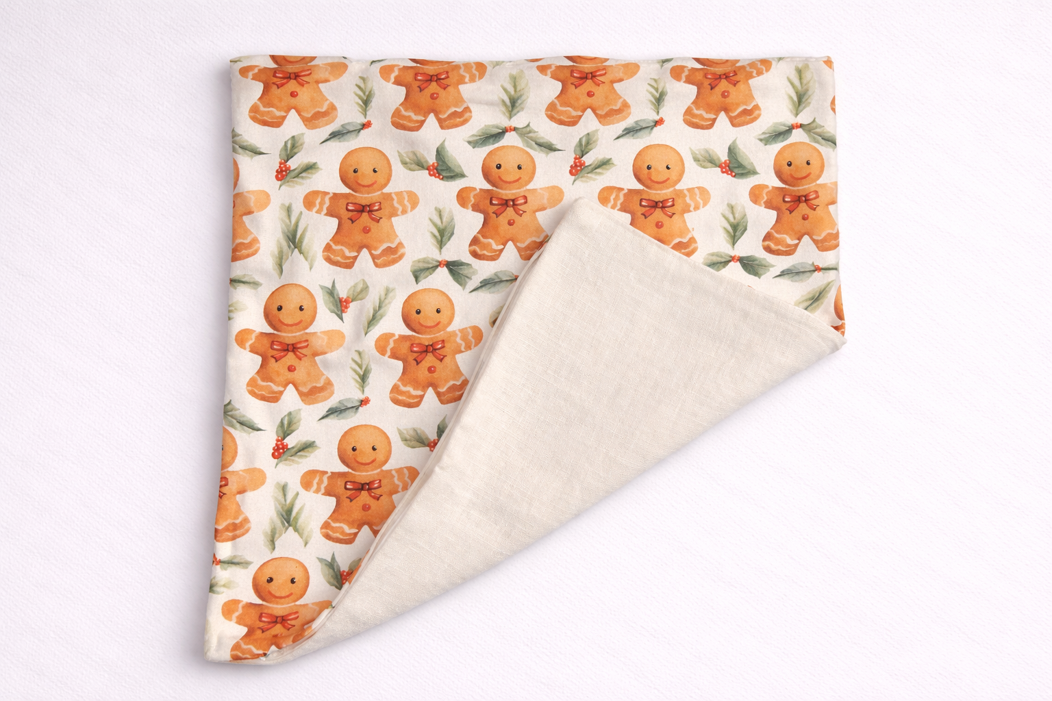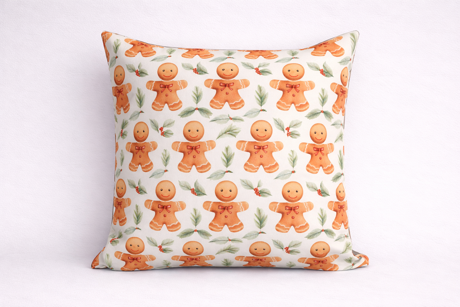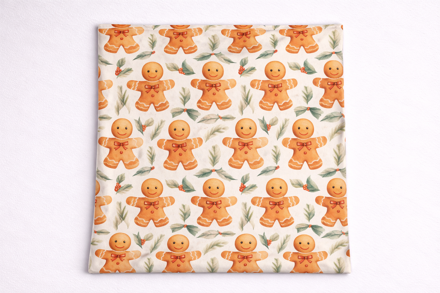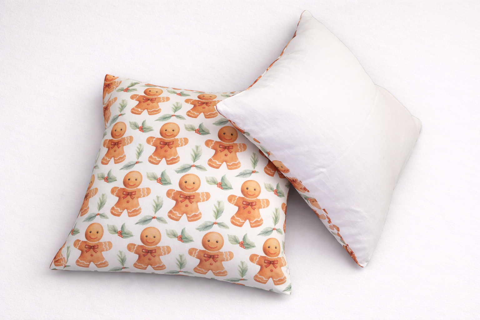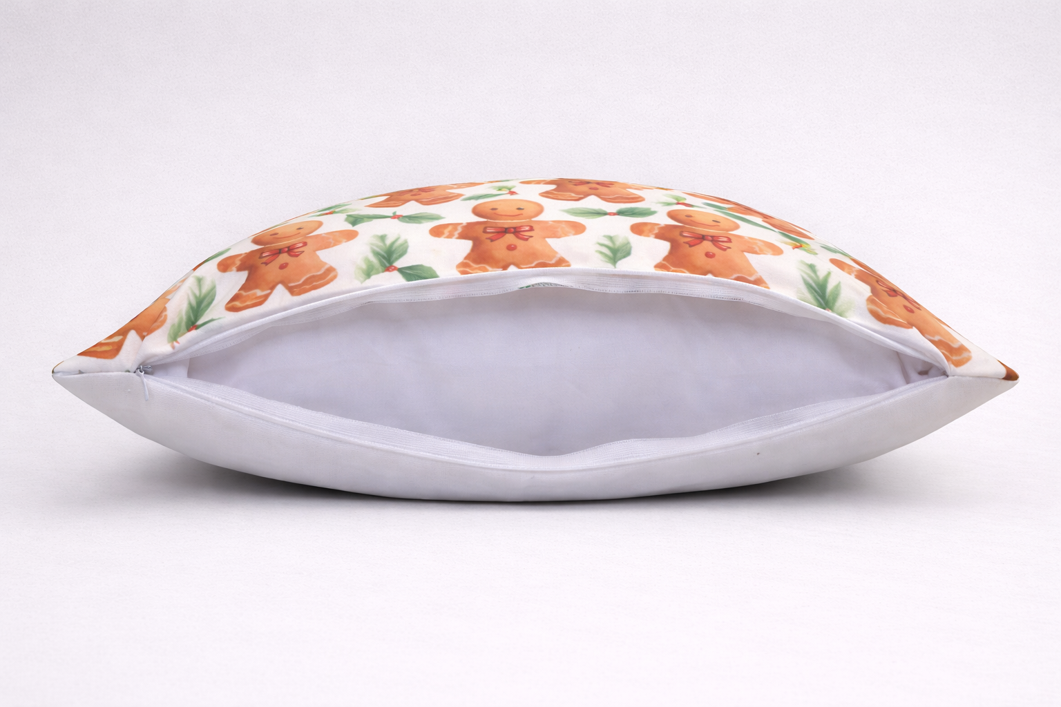 Dizains: 1 gab dekoratīvā spilvendrāna 45 x 45cm ar slēdzēju. Spilvendrānai viena puse trikotāža ar dizainu – lielās piparkūkas un otra puse lina auduma krāsa – balta. Slēptais slēdzējs, krāsa – balta.