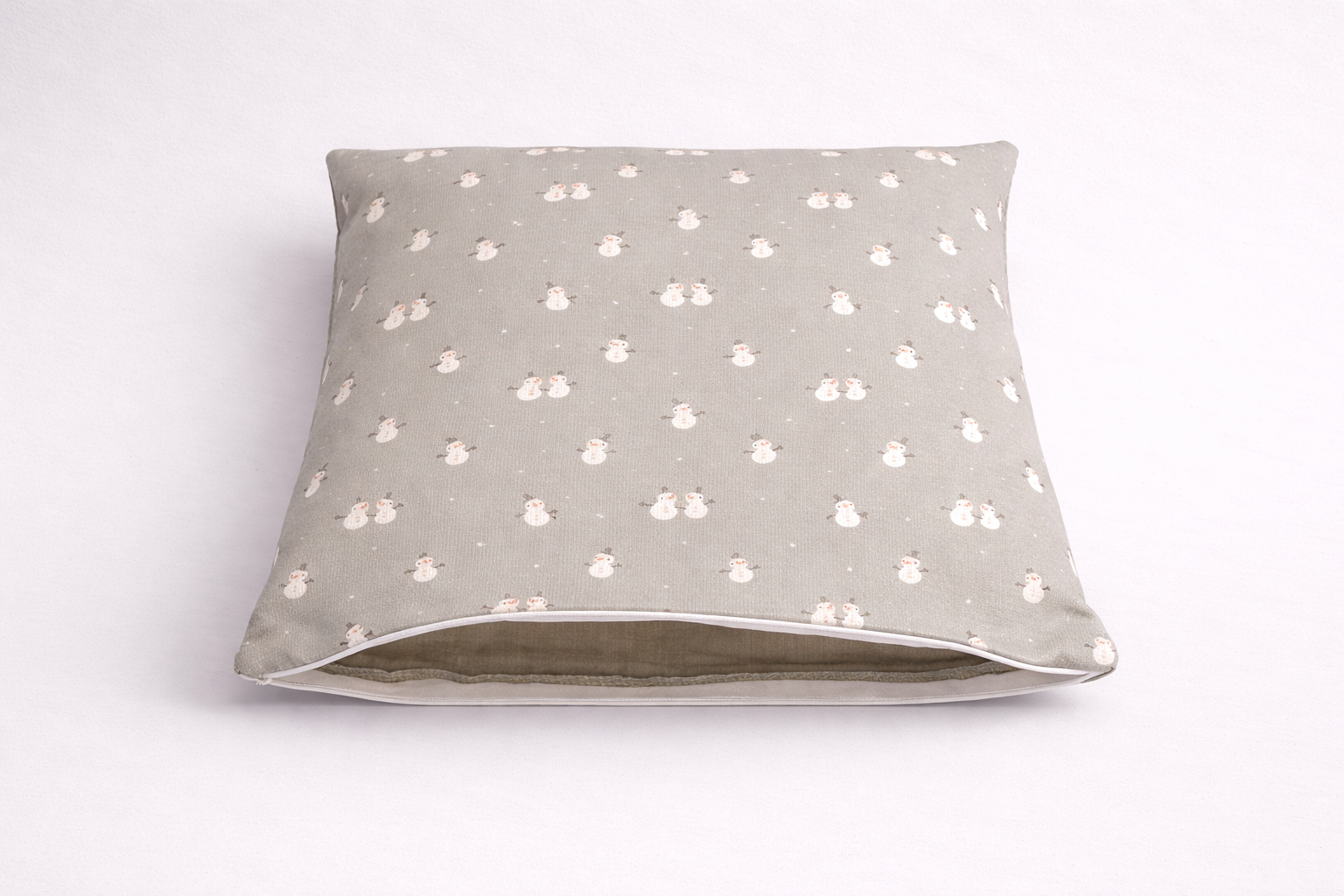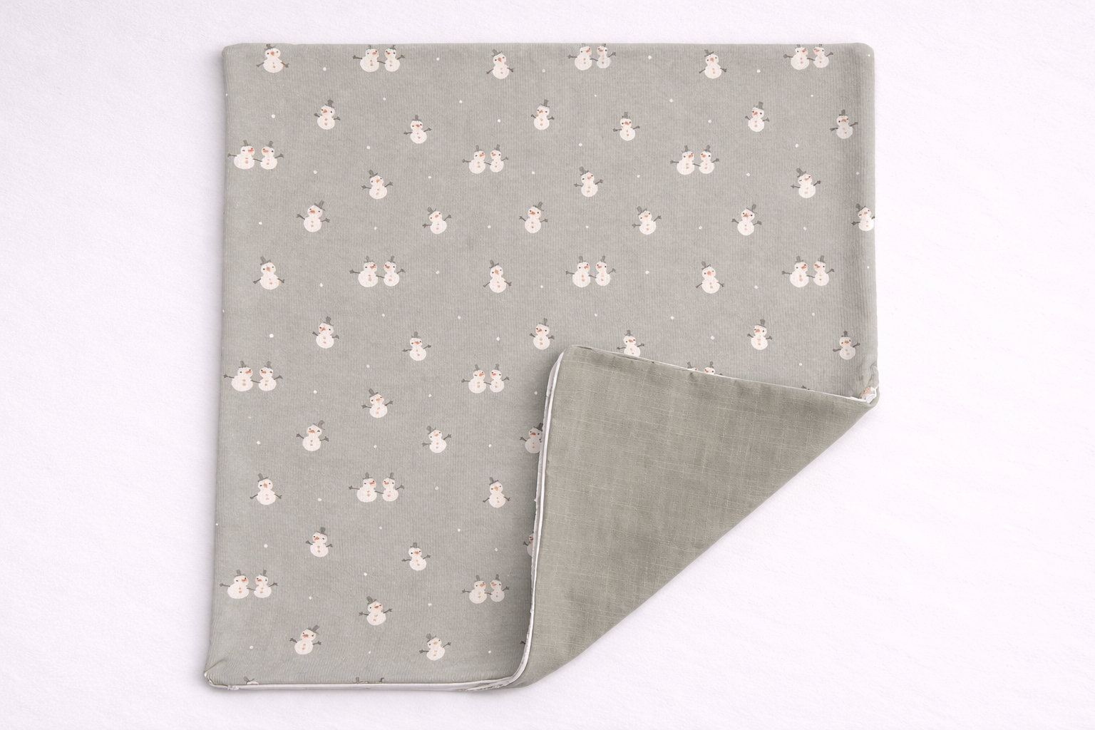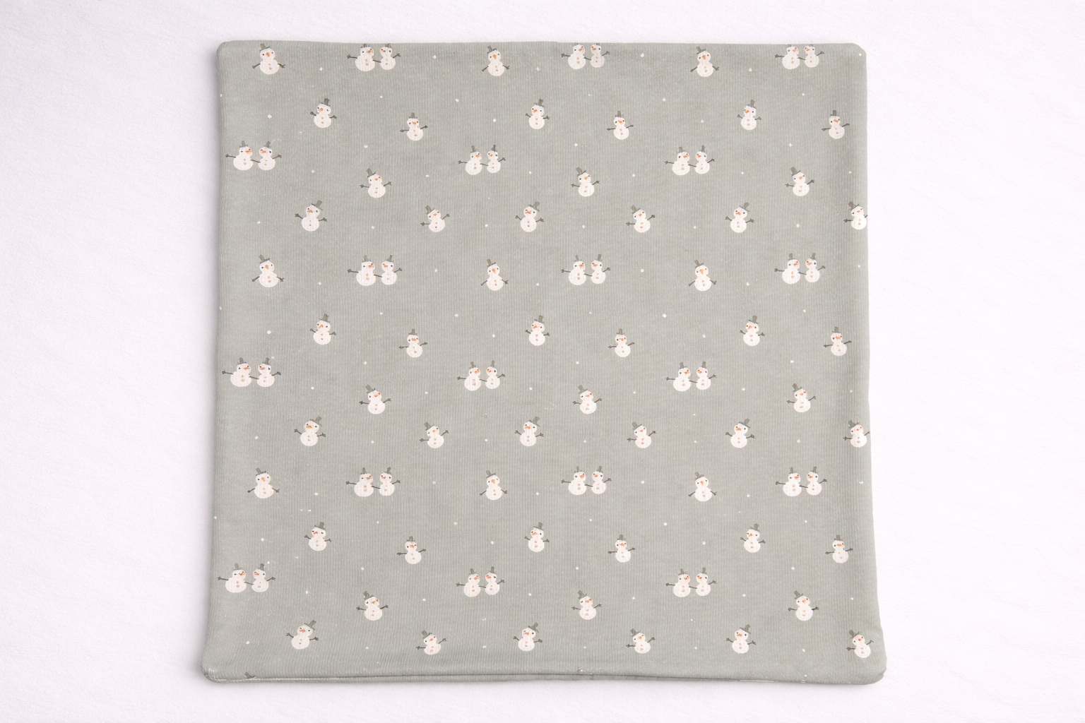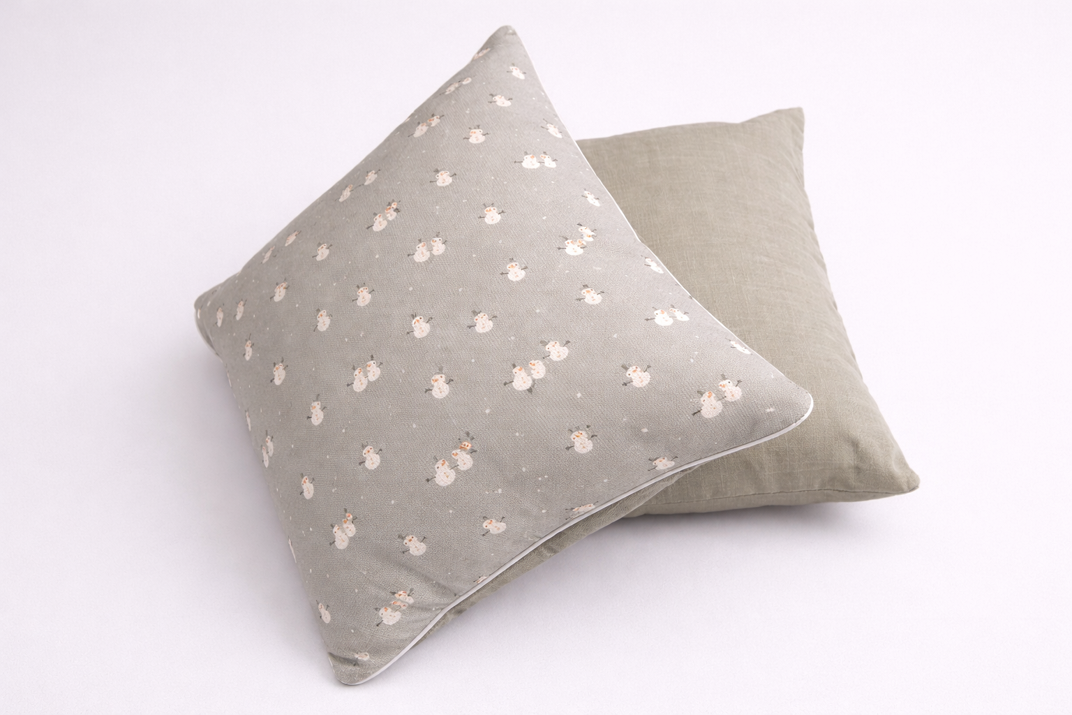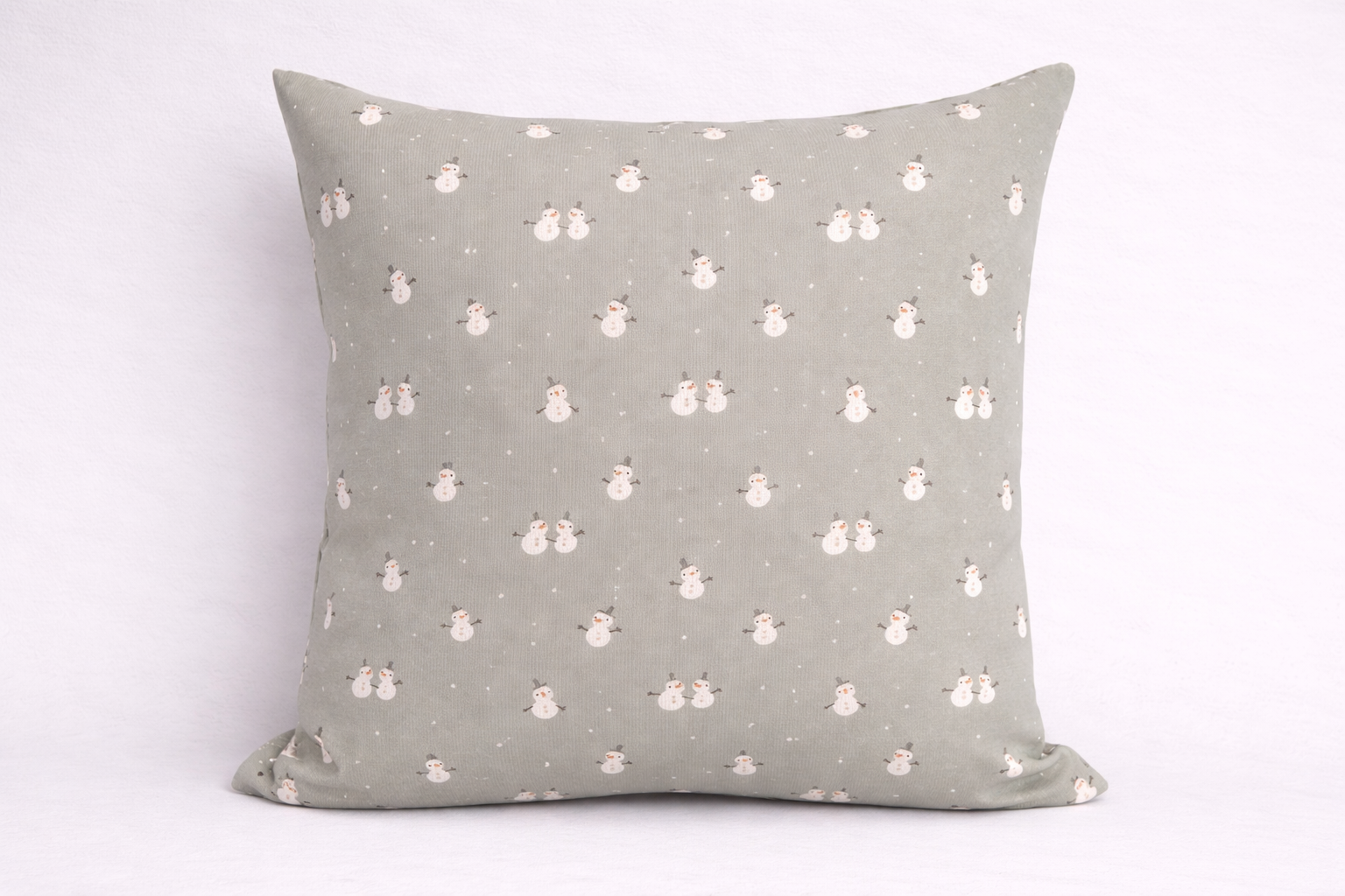 Dizains: 1 gab dekoratīvā spilvendrāna 45 x 45cm ar slēdzēju. Spilvendrānai viena puse rievotā trikotāža ar dizainu – sniegavīriņi un otra puse lina auduma krāsa – gaiši zaļa. Slēptais slēdzējs, krāsa – balta.